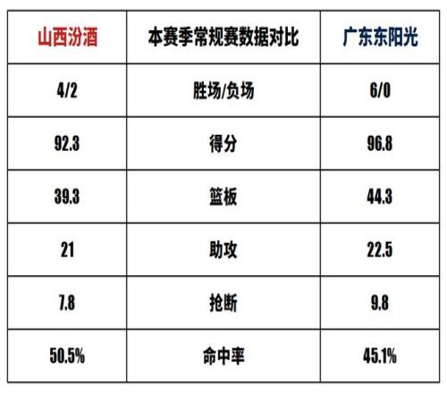 山西汾酒与广东东阳光历史上一共交手48次,山西汾酒10胜38负。上赛季两队交手7次,山西汾酒6胜1负。