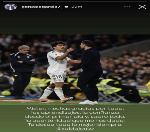 同样发声的还有贡萨洛-加西亚。这名21岁的西班牙前锋是在阿隆索执教期间于去年夏天世俱杯完成一线队亮相,并最终成为赛事最佳射手。贡萨洛-加西亚在个人社媒动态中表示:“教练先生,衷心感谢您为我所做的一切。感谢您的悉心指导,也感谢您从第一天起给予我的信任,尤其是给了我这次宝贵的机会。祝您未来一切顺利。”