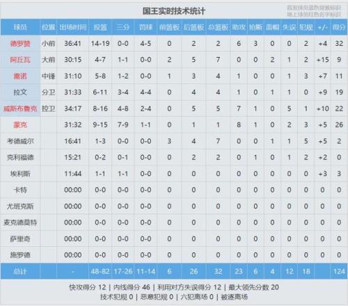 德罗赞32分2板6助3断、蒙克26分8助、威少22分5板7助,正负值+10全场第二。威少和蒙克,两个湖人旧将联手投进11记三分,湖人全队三分36中8!东契奇空砍42分7板8助4断、詹姆斯22分4板3助。湖人三连败,最后看看数据: