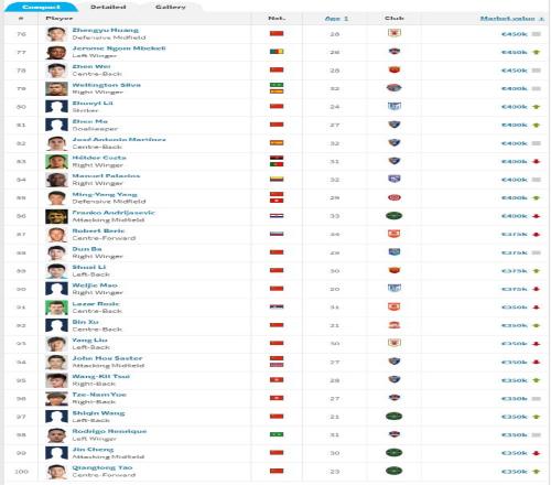 以200万欧元并列第四的球员有四位,分别是青岛西海岸的里切利和阿齐兹、成都蓉城的罗慕洛和上海海港的维塔尔。天津津门虎的阿代米、上海申花的米内罗以180万欧元并列第8。北京国安的法比奥和中国国脚塞尔吉尼奥以170万欧元并列第10。