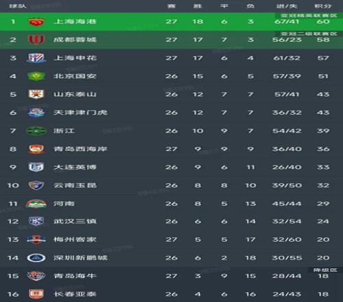 北京时间10月18日,昨晚随着上海海港4-3青岛海牛,成都蓉城3-1梅州客家,上海申花2-1青岛西海岸的比赛结束,中超第27轮结束了三场比赛,最新积分榜如下!