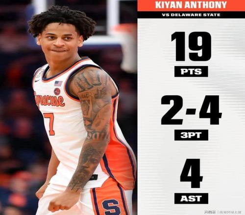 在此前结束的一场雪城大学VS德拉瓦州立大学的NCAA常规赛里,小甜瓜基扬安东尼迎来了他大学生涯的首次首发。此役,基扬安东尼全场出战29分钟,11投8中,三分4中2,4罚1中,贡献19分3篮板4助攻1抢断,且全场没有出现任何一次失误。