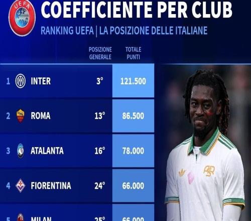 意甲俱乐部欧战积分排名:国米断档第1,米兰第5,尤文第6