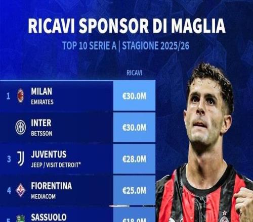 北京时间11月30日,德转统计出了本赛季意甲俱乐部球衣胸前广告年赞助费TOP10,AC米兰和国际米兰以3000万欧元并